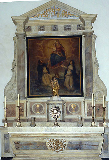 Anciennement peint en faux marbre vert et bleu. Autel de forme trapézoïdale ; tabernacle rectangulaire à porte en bois ; gradin d'autel ; prédelle. Retable architecturé contenant un tableau du Rosaire (1om1023).