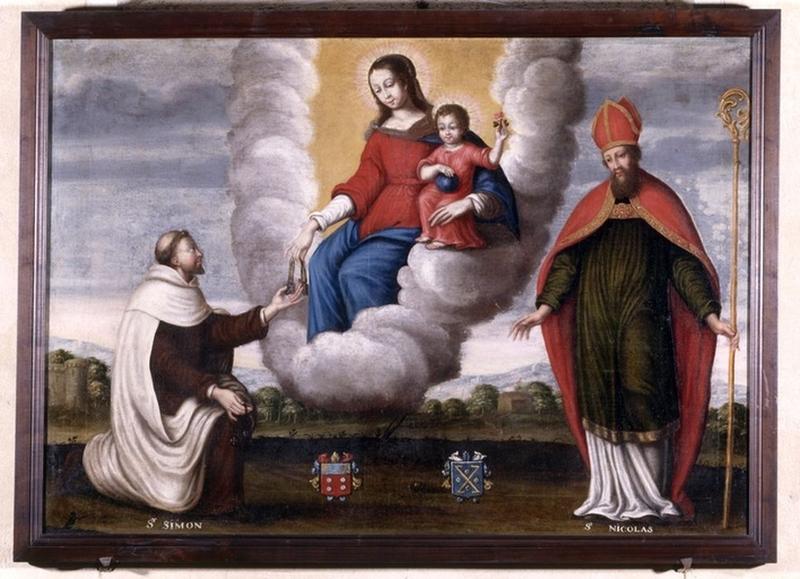 La Vierge et l'enfant Jésus assis sur des nuées formant un demi cercle, elle remet le scapulaire à saint Simon, saint Nicolas en évêque mitré avec crosse sur le côté droit de la composition.