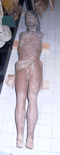 Mutilé : sans bras, ni pieds. Désinsectisation par rayonnement gamma et injection de Perxyl 10 par Arc-Nucléart en 2006 + établissement d'un constat d'état : observation de la structure : L'uvre est composée de deux morceaux de bois assemblés puis taillés. Le plus gros morceau a servi pour sculpter la face avant. Le morceau rajouté a permis de tailler les talons des deux pieds, le morceau cuisse/fesses (aujourd'hui fracturé en trois éléments) et la partie supérieure du dos. Parmi ces éléments, le talon droit et la partie supérieure du dos ont disparu ; Le talon gauche et la partie située entre les deux fesses se sont désolidarisés de l'ensemble et sont conservés dans une enveloppe attenante ; les deux fragments cuisses/fesses sont fixés avec des clous. La fesse gauche ne tient plus que par un clou et présente une forte mobilité. La fesse droite, mieux maintenue (au moins deux clous) est légèrement mobile. Les deux bras ont disparu ; il ne subsiste qu'un infime fragment vermoulu du bras gauche. L'assemblage des bras était assuré par de gros clous carrés en fer forgé. Quatre autres clous, du même type, sont plantés dans le crâne (trois à l'arrière, un sur le côté gauche). Leur fonction n'est pas précisément définie, ils servaient peut être à fixer une couronne d'épine ou une auréole (bien que leur section soit un peu disproportionnée par rapport à l'élément qu'ils étaient supposés maintenir). La tête est fracturée en deux endroits, les fragments ont été remis en place et fixés avec plus ou moins de succès. Le fragment au premier plan (qui conserve tout le visage) est fixé par des clous fortement oxydés, il présente une légère mobilité et son positionnement n'est pas bon, notamment dans la partie supérieure. A cet endroit, la fissure est ouverte sur une largeur d'environ cinq millimètres. La fracture au second plan est dans un axe légèrement décalé par rapport à la première. Le fragment a été collé et présente un léger décalage. Il est possible que cette découpe résulte d'un clivage partiel qui aurait été agrandi en découpant avec une scie. Dans ce cas, le décalage pourrait résulter de la perte de matière engendrée par la découpe. A droite de la tête, deux boucles de cheveux, sculptées dans un morceau séparé, ont été fixées avec des clous (un dans chaque mèche). La corrosion des clous a rendu ces assemblages légèrement mobiles. De nombreuses fissures de dessiccation sont visibles, disséminées un peu partout et, notamment, sur le torse. Elles sont généralement assez courtes et peu profondes. Sur un pli du périzonium, on observe un enfoncement consécutif à un choc. Le bois vermoulu s'est fracturé à cet endroit. Au revers, au dessus de la fesse droite, un manque dans le bois montre que le morceau utilisé pour la taille a été débité près de la surface, comme l'atteste un restant d'écorce. L'uvre ne peut pas être remise sur une croix dans les conditions actuelles. Observation de la surface : La surface présente un empoussièrement uniforme. Un repeint est présent en surface, comme l'indique la présence de peinture directement appliquée sur le bois. Quelques lacunes font apparaître une très faible couche de préparation (il s'agit peut être d'un résidu d'une ancienne préparation qui aurait été décapée). Par endroit, c'est le bois qui est directement apparent. Sur les hanches et les membres inférieurs, on observe de larges auréoles d'origine indéterminée (humidité ? projections ?). A ces endroits, la polychromie est parcourue d'un très fin réseau de micro-fissures. Campagne de désinfection réalisée par Pascale Deloddere et Aurélie Amiot le 17/01/2011 : déballage, aspiration, remballage.