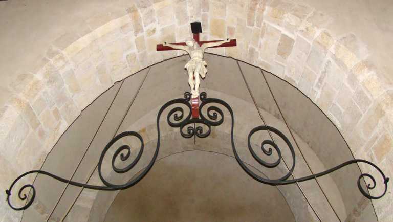 Poutre de gloire en fer forgé peint en noir à volutes ; statue du Christ en bois tilleul polychrome, croix en chêne ; pas de titulus.