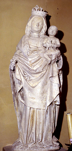 La Vierge couronnée à la longue chevelure ondulée tient l'enfant Jésus sur le bras gauche et un bouquet dans la main droite ; l'enfant tient une colombe dans ses 2 mains.Les plis du vêtement se cassent en V, et des brisures aux pieds de la Vierge.
