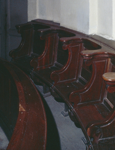 En bois ; composées de 2 éléments de 3 sièges et 2 éléments de 8 sièges en demi-cercle adossés à l'abside.