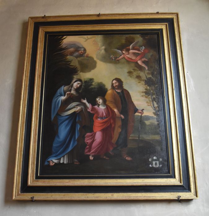 Saint Joseph tient l'Enfant Jésus par la main, la Vierge à leurs côtés. En haut à gauche Dieu le Père observe la scène, la colombe du saint Esprit au-dessus de lui. A droite, un ange tient des branches fleuries.