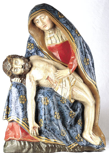 La Vierge assise tient le Christ mort sur les genoux ; elle porte un riche manteau de brocart sur fond bleu.