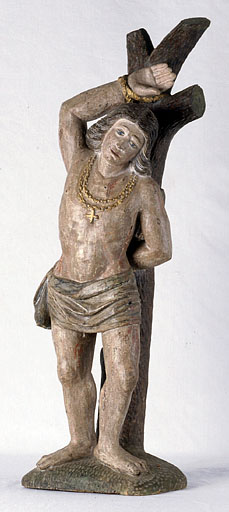 Saint Sébastien à la silhouette trapue, est lié à un tronc d'arbre, nu avec un simple voile à la ceinture ; traces de blessures sur le torse provenant des flèches (manquantes, si tant est qu'il y en ait eu) ; il porte un collier à 2 rangs orné d'une croix.
