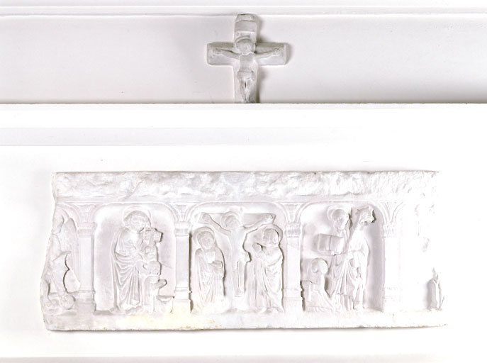 Fragment de retable en pierre ; décors sculpté en bas-relief.