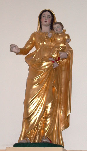 Ronde-bosse en bois de sapin doré, visages, mains, cheveux et pieds en bois polychrome ; coeur de dévotion autour du cou.