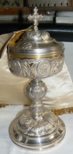 Ciboire avec son couvercle en argent repoussé et argent doré. Fausse coupe ajourée.
