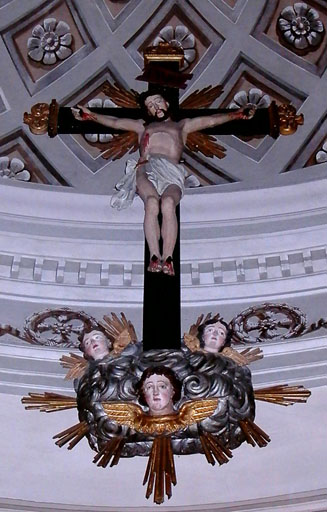 La croix repose sur des nuées rayonnantes avec 3 têtes d'angelots ailés ; Christ représenté les pieds joints.