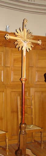 Croix en bois doré, statue en bois polychrome ; croix de procession placée dans un trépied de maintien ; croisillon rayonnant ; extrémités de la croix ouvragées ajourées.