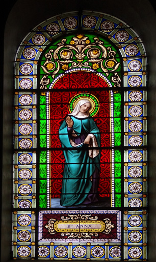 Personnage au centre d'un arc en plein cintre à fond à effet damassé rouge, surmonté de rinceaux floraux ; frise de médaillons autour de la verrière ; nom de la sainte dans un cartouche en partie basse. Sainte Anne bénissant de la main droite, tient les plis de sa robe de sa main gauche.