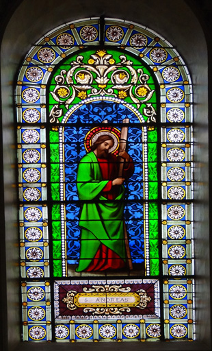 Personnage au centre d'un arc en plein cintre à fond à effet damassé bleu, surmonté de rinceaux floraux ; frise de médaillons autour de la verrière ; nom du saint dans un cartouche en partie basse. Saint André est représenté de profil tenant une croix en X.