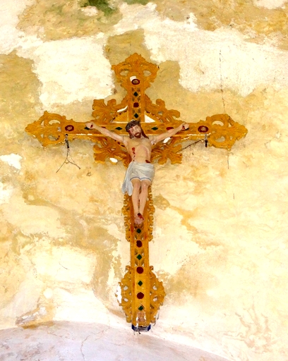 Croix en bois doré ajouré sculpté et Christ en bois polychrome ; traces des anciens emplacements des 3 clous en bois qui supportait un voile en tissu au-dessus de la tête du Christ.