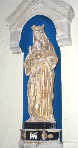 Vierge à l'Enfant : la Vierge tient l'enfant Jésus devant elle dans ses bras, il tient un globe dans la main gauche et bénit de la main droite.