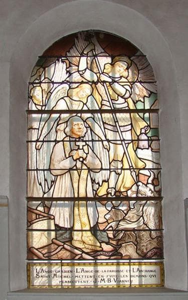 Verrière à personnage : Saint Jean-Marie Vianney, curé d'Ars avec les anges
