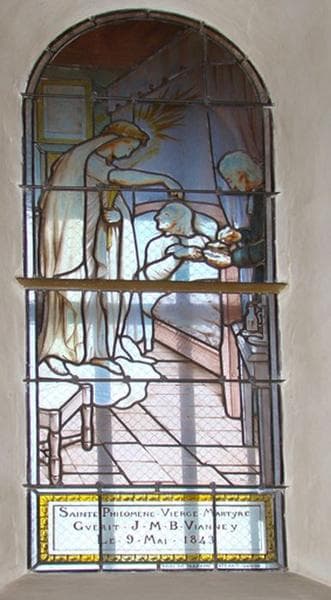 Verrière à personnage : Guérison de saint Jean-Marie Vianney, curé d'Ars par sainte Philomène