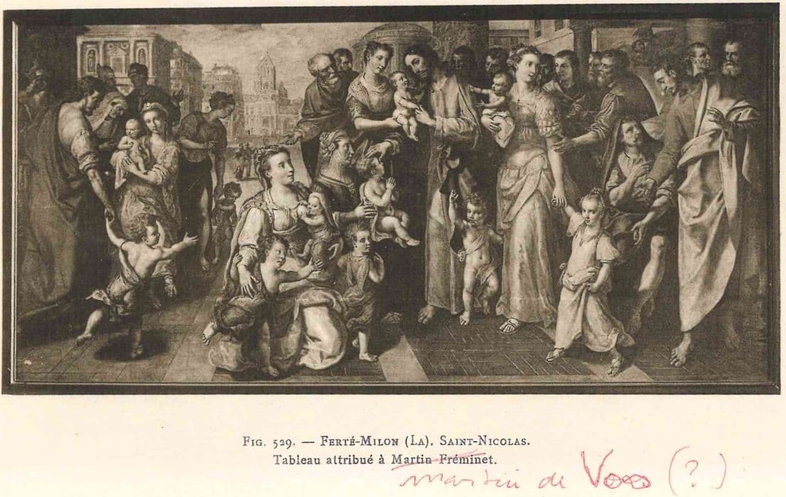 Banc d'oeuvre du 17e siècle orné au dos d'une toile attribuée à Martin Fréminet ou à Martin de Vos, 16e siècle.