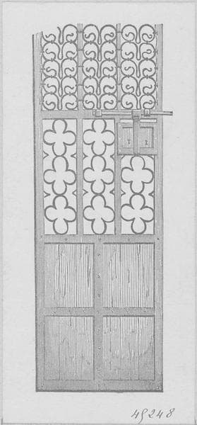 La partie inférieure de chacune de ces portes absolument semblables, comptent quatre panneaux de fer plein aminci au marteau, maintenus par des rivets et séparés par deux traverses cruciformes. La partie supérieure est ajourée par des brindilles en forme de quadrilobes ou d'enroulements et fixées aux montants par des embrases contournées à chaud et non soudées.