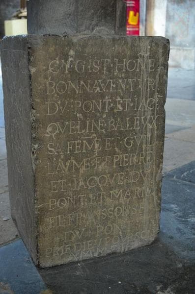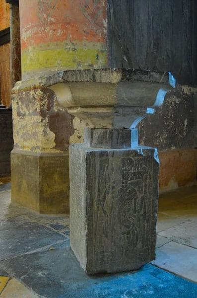 Le socle est une pierre funéraire sculpté en méplat réemployé.