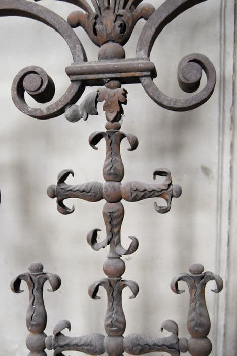 Ensemble en fer forgé, décor symétrique de volutes et de rinceaux, motif IHS. Actuellement constitué de quatre panneaux verticaux fixes, dont un panneau inversé en plan, plus un battant portant le monogramme IHS, déposés dans la chapelle.