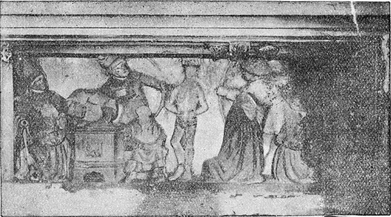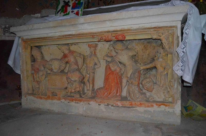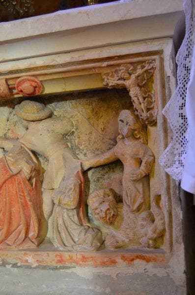Sont sculptées deux scènes votives et trois donateurs accompagnés de leurs patrons, au centre le martyre de saint Sébastien, à sa droite les saints Crépin et Crépinien, deux frères issus de la noblesse romaine qui, pour fuir les persécussions, se firent apprentis cordonniers à Soissons. L'un deux travaille sur un établi, alors que l'autre, vêtu d'un tablier de cuir par-dessus sa robe, travaille sur ses genoux, placé à une hauteur inégale sur un tabouret. Au centre de la composition, saint Sébastien, adossé à une colonne à laquelle il est lié par une corde passant autour de ses chevilles, les mains liées dans le dos, il est vêtu d'un simple périzonium. Il reçoit deux flèches de deux archers placés symétriquement. Celui de gauche porte une coiffure rappelant les costumes de théâtre du Moyen-Age, il a un visage exprimant la brutalité. Un cardinal, à la tête mutilée, est agenouillé de profil, il est placé devant l'archer de droite. Dans la bordure du bas-relief, eu-dessus de sa tête, sont représentés un chapeau de cardinal et un blason comportant un lion passant vers la gauche et des lambrequins. A droite du prélat, un autre personnage, agenouillé et portant une robe de bure, est tourné vers la gauche. Il s'agit d'un religieux. A l'extréminé droite du bas-relief, représentation de sainte Marguerite. Elle est vêtue d'une robe, les cheveux ondulés tombant sur ses épaules . A ses pieds, le dragon la gueule largement ouverte.