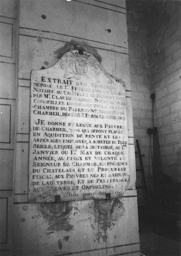 plaque commémorative de fondation aux armes de Claude-Gabriel Douet de Vichy, seigneur de Charmeil