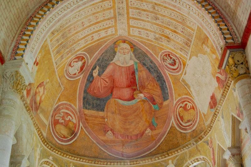 Dans le cul de four de l'abside est représenté un Christ en majesté entouré des symboles des évangélistes. Dans le choeur, entre les fenêtres, sont peints des figures de saints et de saintes de la fin du 15e siècle.