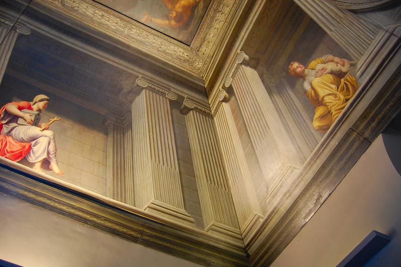 Le plafond se compose de dix-sept toiles enchâssés dans une structure en bois et mêle le plafond plat à la française et le trompe-l'oeil italien.