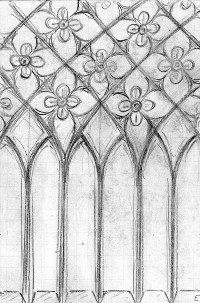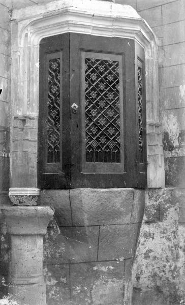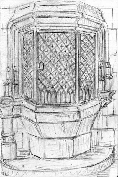 Composés d'une cuve à trois pans et accompagnés d'une piscine ronde montée sur un pied annelé, ils sont fermés par une grille gothique en bois découpé et sculpté.