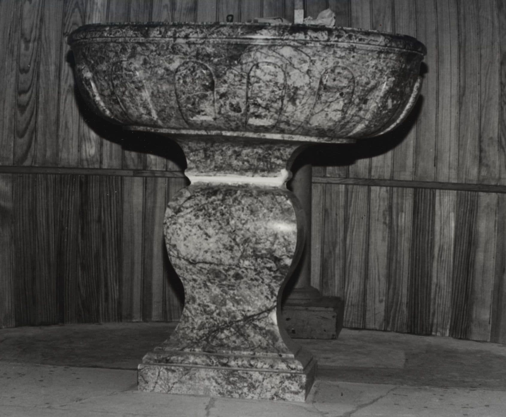 Fonts baptismaux en marbre de Diou. Cuve ovale à deux compartiments, sculptée de larges godrons, reposant sur un fût galbé.