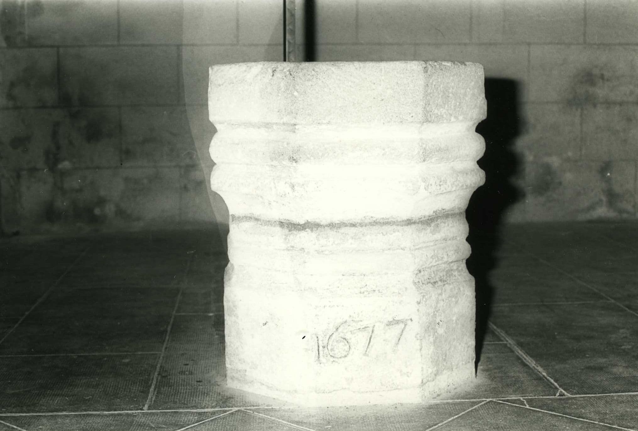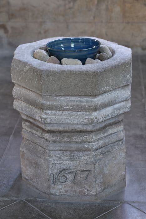 La pierre étant très poreuse, ce bénitier a été garni d'un intérieur de plomb, pour éviter qu'il n'absorbe l'eau.