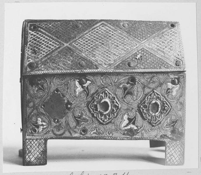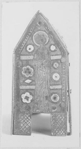 Petite en forme de maisonnette contenant des reliques de saint Blaise. Cabochons de verroterie jaunes