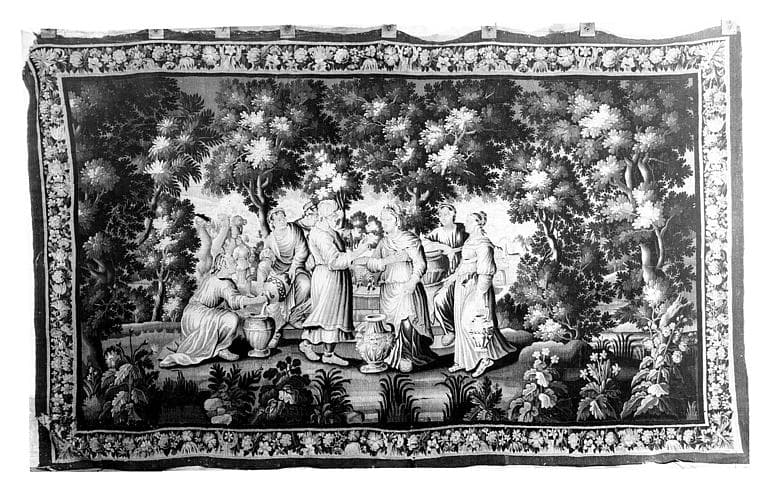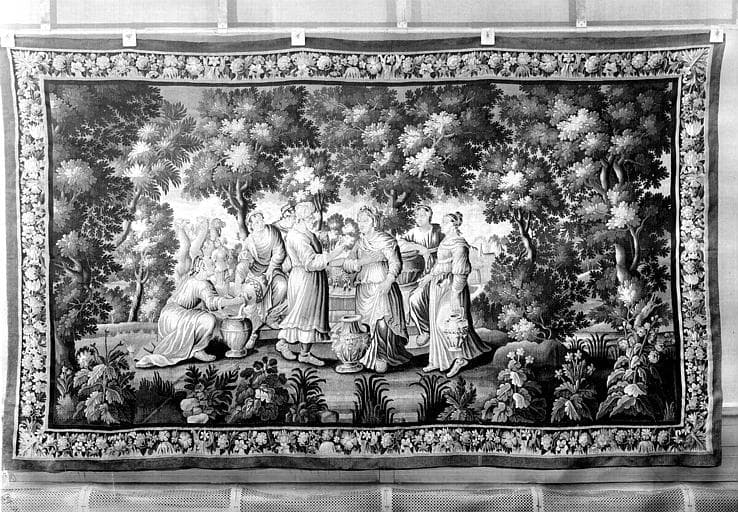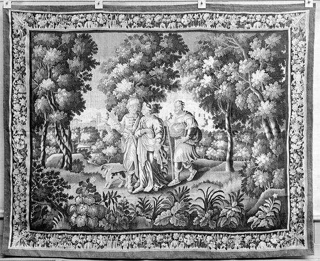 3 pièces murales (verdures) : Eliezar et Rébecca, une femme debout, personnages en promenade