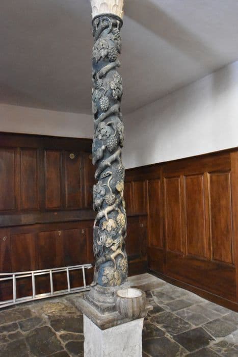 Les chapiteaux sont décorés de feuillages stylisés et les colonnes, de forme torse, sont ornées de pampres et d'oiseaux.