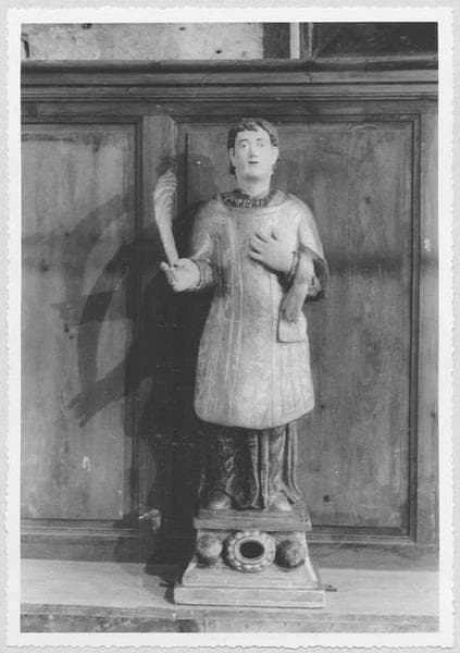 Saint Etienne est représenté en diacre. Il tient d'une main une palme et de l'autre une pierre. Sur le socle sont également sculptées deux pierres, symboles de son martyre.