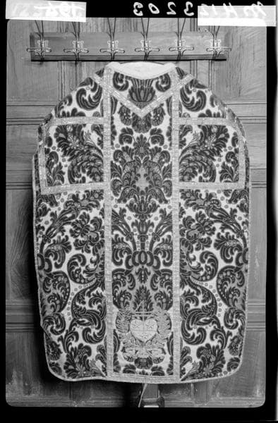 POP | Plateforme ouverte du patrimoineornement sacerdotal complet : chape, dalmatique, chasuble et accessoires, damas blanc broché de grands ramages rouges