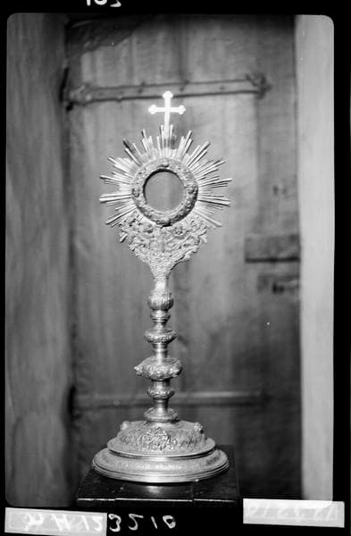 Autour de la montre : nuée et chérubins reposant sur un motif décoratif avec pampres de vigne, épis de blé et palmettes. Sur le noeud et les collerettes : multiples décors (saint Joseph).