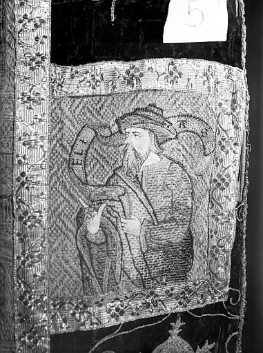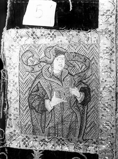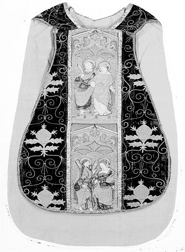 Velours violet à décor de chardons d'or entourés de rinceaux. Orfrois ornés de personnages brodés de soie, représentés deux à deux sous des niches.