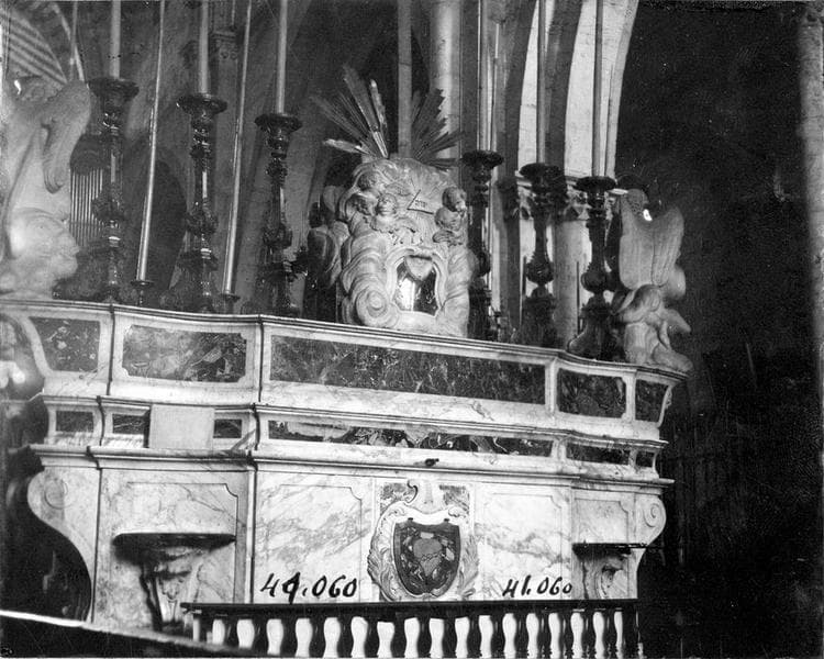 Croix sur rais flamboyants surmontant le tabernacle du maître-autel. Six grands chandeliers et six chandeliers de taille moyenne garnissant le maître-autel. Deux torchères accostant le tabernacle.
