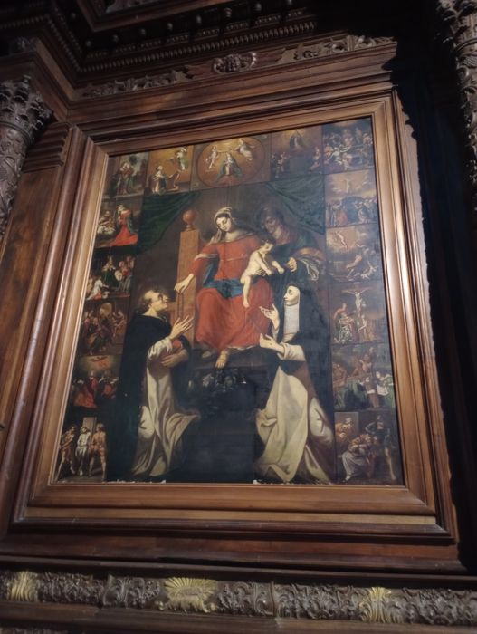 Vierge à l'enfant, remise : rosaire, saint Dominqiue, sainte Catherine de Sienne, scène : rosaire