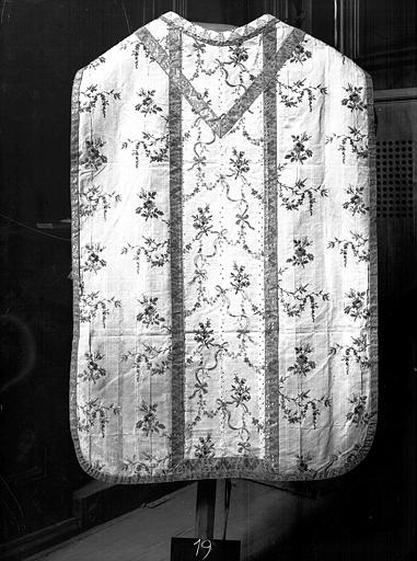 Tissu dauphine, fond blanc à bandes décorées de très petits bouquets. Croix du dos de la chasuble rapportée, à fond blanc avec grands bouquets polychromes largement jetés, bordée d'une ganse. Doublure de satin moiré rouge à ramages. Premier voile : étoffe de la croix de la chasuble. Second voile, double face : d'un côté étoffe du fond de la chasuble, de l'autre côté étoffe de la doublure.