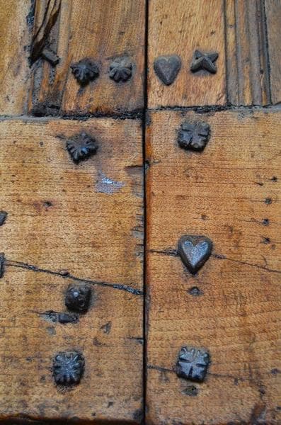 Vantaux : 18 panneaux décorés de draperies, 6 d'entrelacs gothiques, monogramme I H S ; serrure : 3 têtes barbues coiffées de mitres et de tiares, 2 oiseaux ; porte constellée de clous dont les têtes représentent des coeurs, des coquilles, des fleurs de lys, des dauphins.