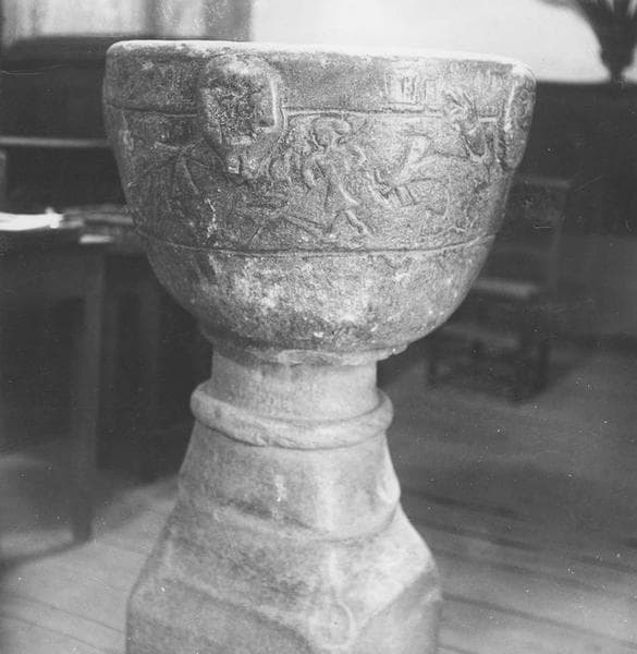 Vasque : quatre têtes en relief, partie supérieure ornée d'une petite tête, une crosse, une croix et une mitre ; partie intermédiaire : un dragon, un bras et une main bénissante, un guerrier et un autre personnage portant une lance, devant lui un chien ou un lièvre, un niveau de maçon, un tau, deux personnages face à face et se donnant la main, une étoile à cinq pointes, un soleil et peut-être un disque solaire, piédestal à triple moulure.