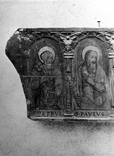 Panneau peint avec arcades sculptées : décor architectural en bas reliefdans la masse ; polychromie ; préparation épaisse blanche recouverte de rouge sur le décor architectural ; préparation blanche perceptible sous le décor peint ; deux consoles de bois clouées au revers