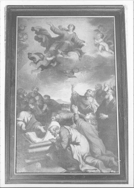 Au haut, la Vierge, vêtue d'une robe rouge et d'un manteau bleu, les bras étendus, s'élève sur sur un nuage soutenu par un ange et trois têtes d'anges ailés. A gauche et à droite, anges en adoration. Au bas, les douze apôtres groupés autour du sépulcre vide de la Vierge qui contient un linceul et des fleurs. Parmi eux, saint Pierre vêtu de bleu et de jaune, saint Jean vêtu de rouge et de vert, agenouillé et élevant ses mains jointes ; un autre apôtre baise le linceul ; les autres sont groupés dans des attitudes diverses. Fond de paysage.