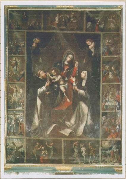 tableau : La Donation du Rosaire à saint Dominique et à sainte Catherine entouré de quinze saynètes