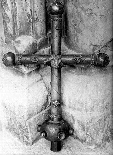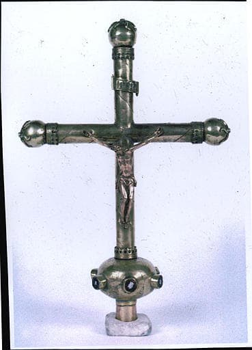 Cabochons d'éamil peint sur le noeud. Christ en croix et INRI à l'avers, Vierge à demi-corps au revers de la croisée. Symboles des quatre évangéliste au revers des bras de la croix.