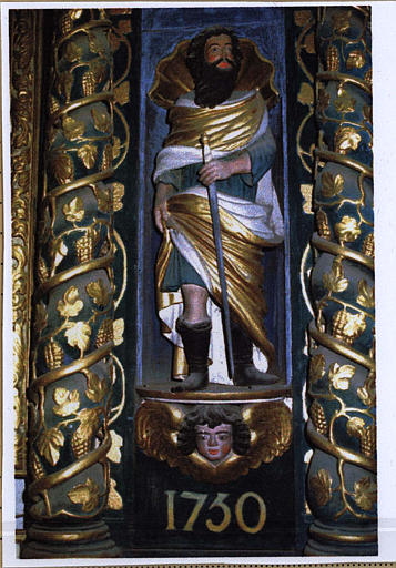 A D 1730 concerne plutôt la redorure ; inscription sur le tableau : HAC ME VESTE CONTEXIT sur le phylactère du Christ ; O VIRUM INEFABILEM sur le phylactère ange de droite : antienne des vêpres de saint Martin, le 11 novembre ; PALMAM MARTIRII NON AMISIT sur le phylactère de l'ange de gauche.