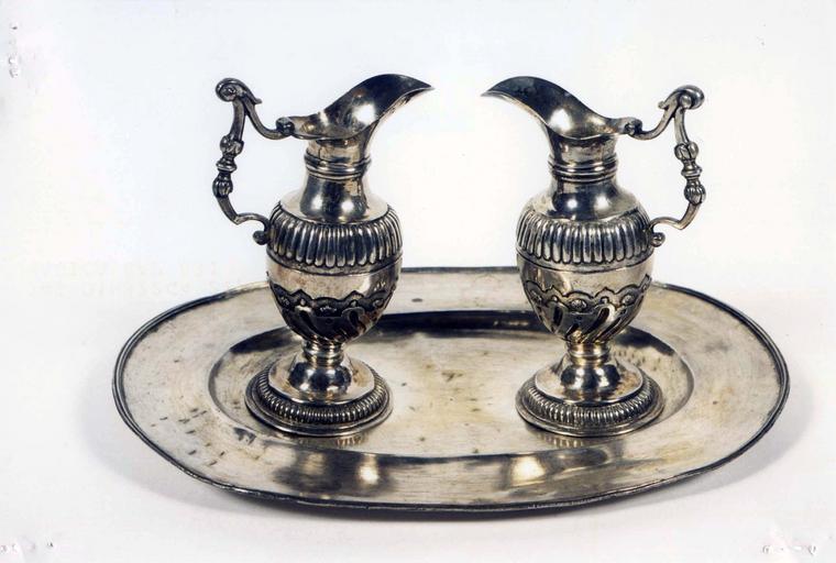 Sur les burettes : maître orfèvre de Dijon pierre Dumont ? ; poinçon de la communauté de Dijon.