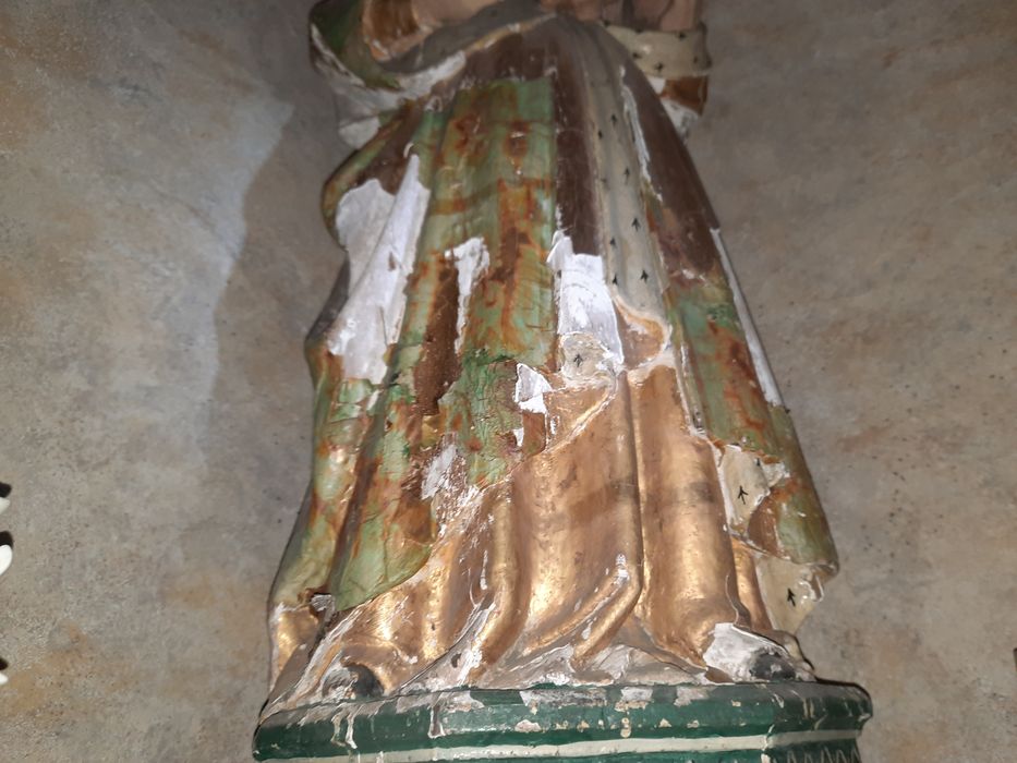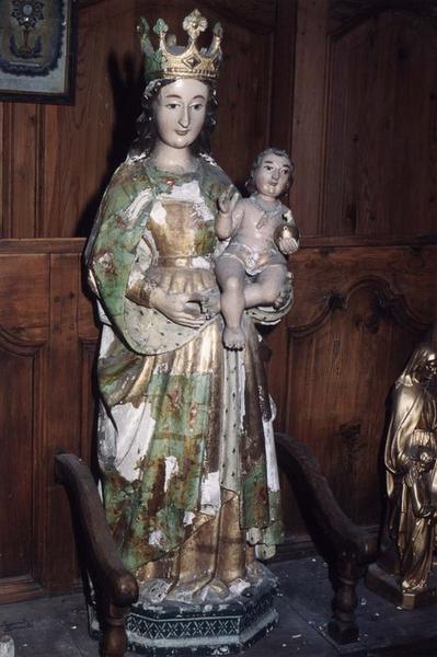 Repeints et dorure plus tardifs. La couronne de l'enfant Jésus, rapportée et clouée, manque. Dorure et apprêt largement écaillés. Grands morceaux de papier vert et brun collé sur le manteau, l'encolure et la couronne de la Vierge.